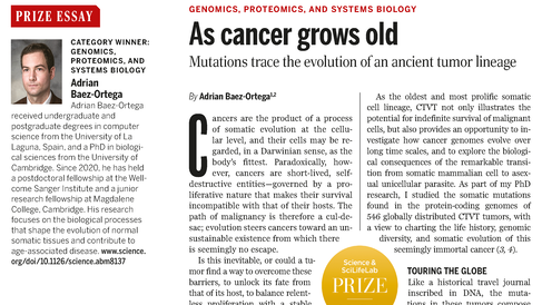Huge congratulations to Adrian Baez-Ortega on being awarded one of the 2021 Science and SciLifeLab Prizes! Adrian won the award for his essay entitled "As cancer grows old", which describes his PhD research investigating the genetics of the canine transmissible venereal tumour. His essay has been published in Science https://www.science.org/doi/10.1126/science.abm8137.